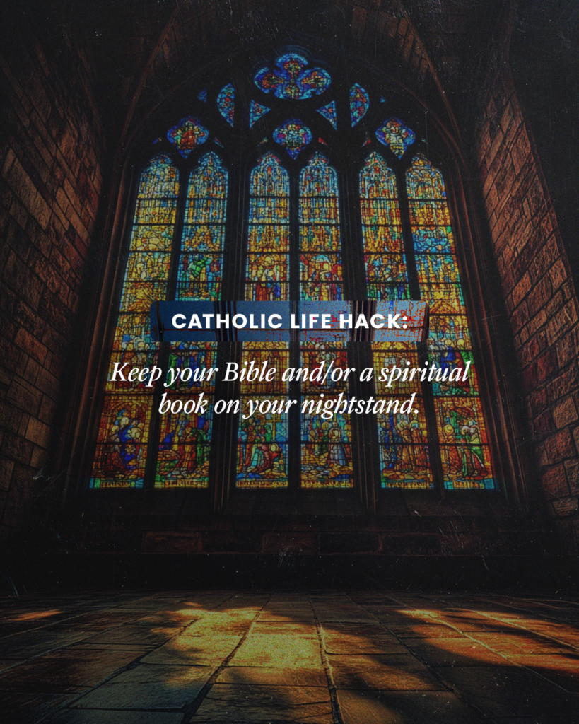 Spiritual reading is key to spiritual growth! Remind yourself of this by placing your Bible or a faith based book near your nightstand. Read a few pages before going to bed each night.