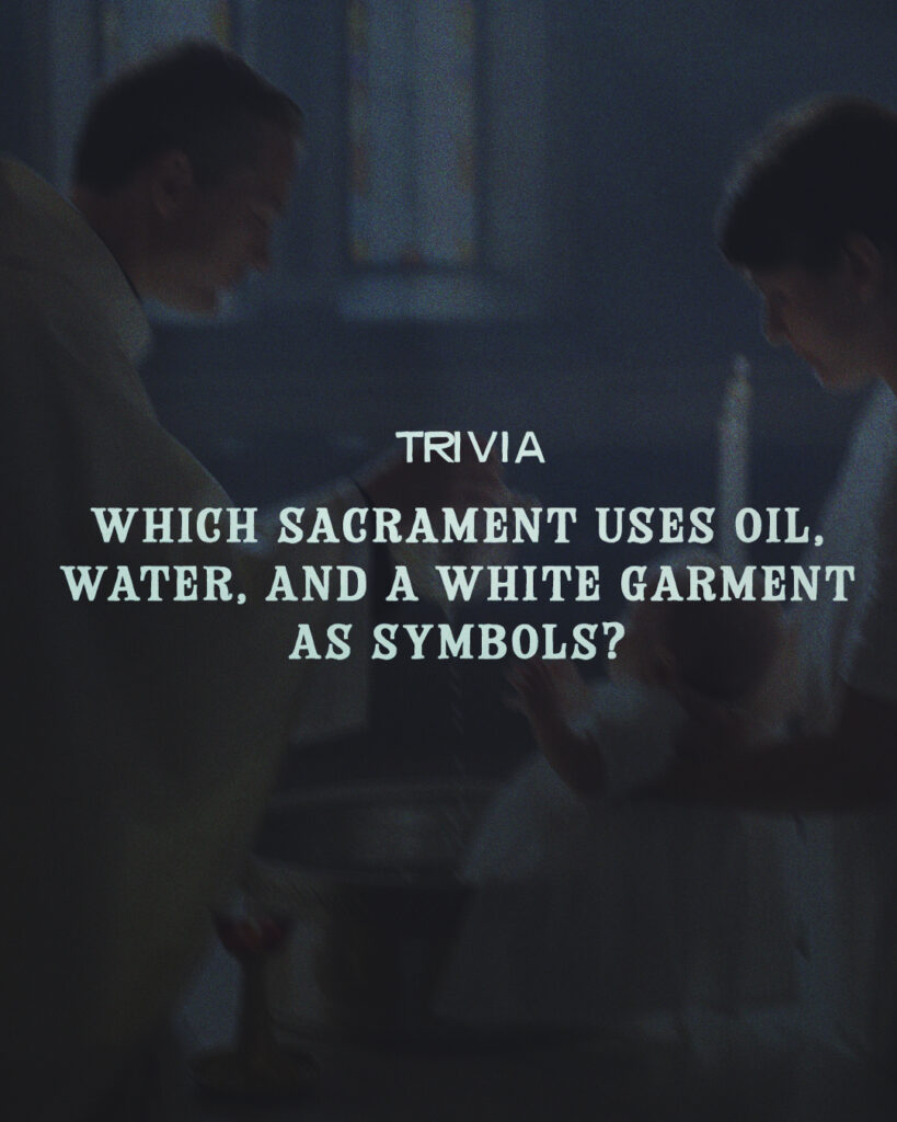 Three powerful symbols... oil, water, and a white garment, are used in which sacrament of the Church? Bonus: What does each symbol represent? Share your guess below. #CatholicTrivia #Sacraments . (Answer: Baptism)