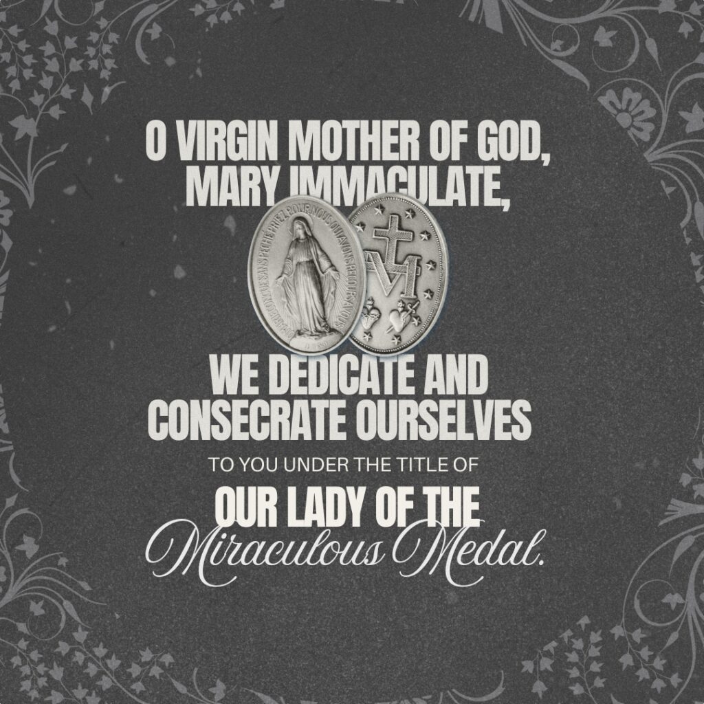 O Virgin Mother of God, Mary Immaculate, we dedicate and consecrate ourselves to you under the title of Our Lady of the Miraculous Medal.