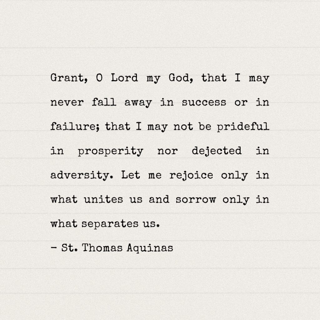 Grant, O Lord my God, that I may never fall away in success or in failure; that I may not be prideful in prosperity nor dejected in adversity. Let me rejoice only in what unites us and sorrow only in what separates us. – St. Thomas Aquinas