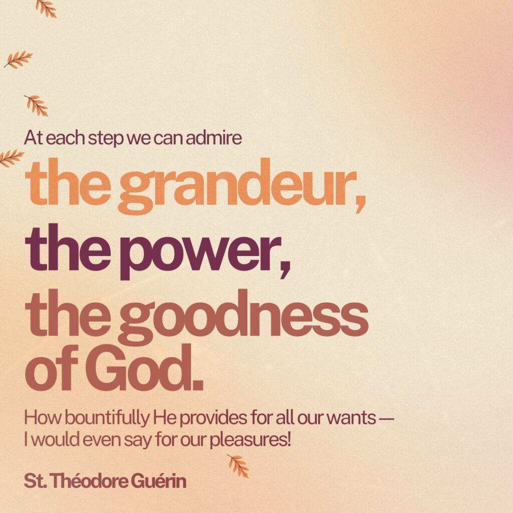 “At each step we can admire the grandeur, the power, the goodness of God. How bountifully He provides for all our wants—I would even say for our pleasures!” — St. Théodore Guérin