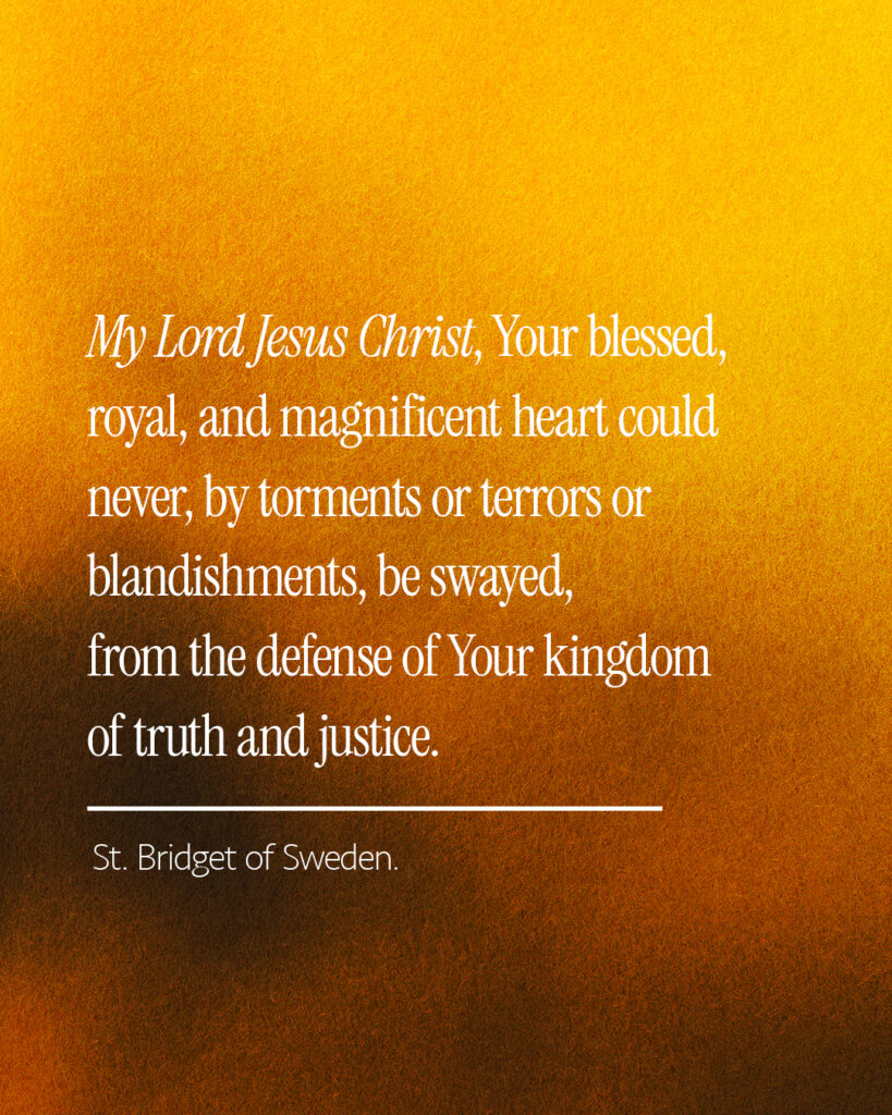 My Lord Jesus Christ, Your blessed, royal, and magnificent heart could never, by torments or terrors or blandishments, be swayed, from the defense of Your kingdom of truth and justice. – St. Bridget of Sweden.