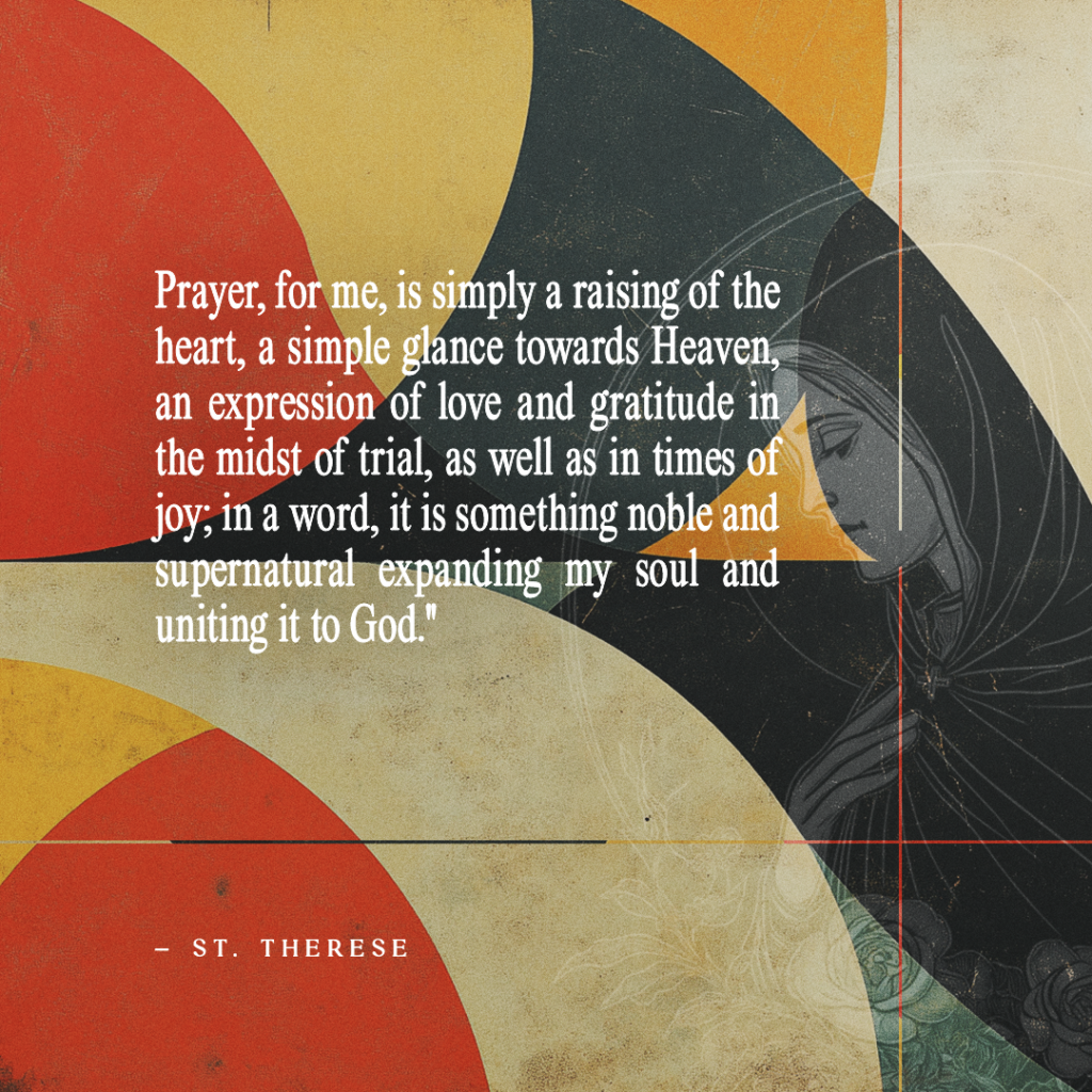 “Prayer, for me, is simply a raising of the heart, a simple glance towards Heaven, an expression of love and gratitude in the midst of trial, as well as in times of joy; in a word, it is something noble and supernatural expanding my soul and uniting it to God.” – St. Therese