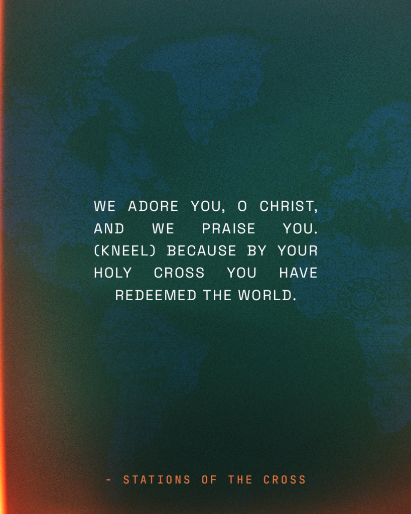 “We adore you, O Christ, and we praise you. (Kneel) Because by your holy cross you have redeemed the world.” – Stations of the Cross