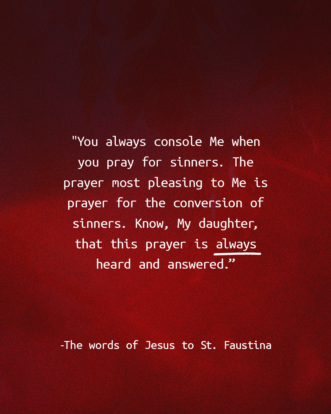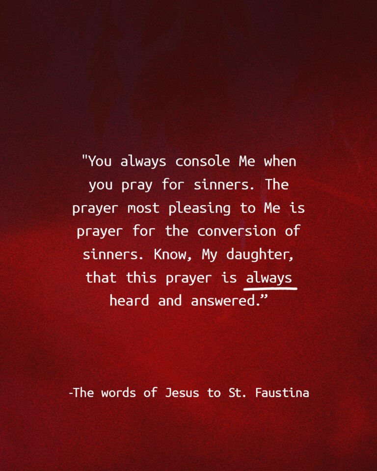 "You always console Me when you pray for sinners. The prayer most pleasing to Me is prayer for the conversion of sinners. Know, My daughter, that this prayer is always heard and answered.'"
